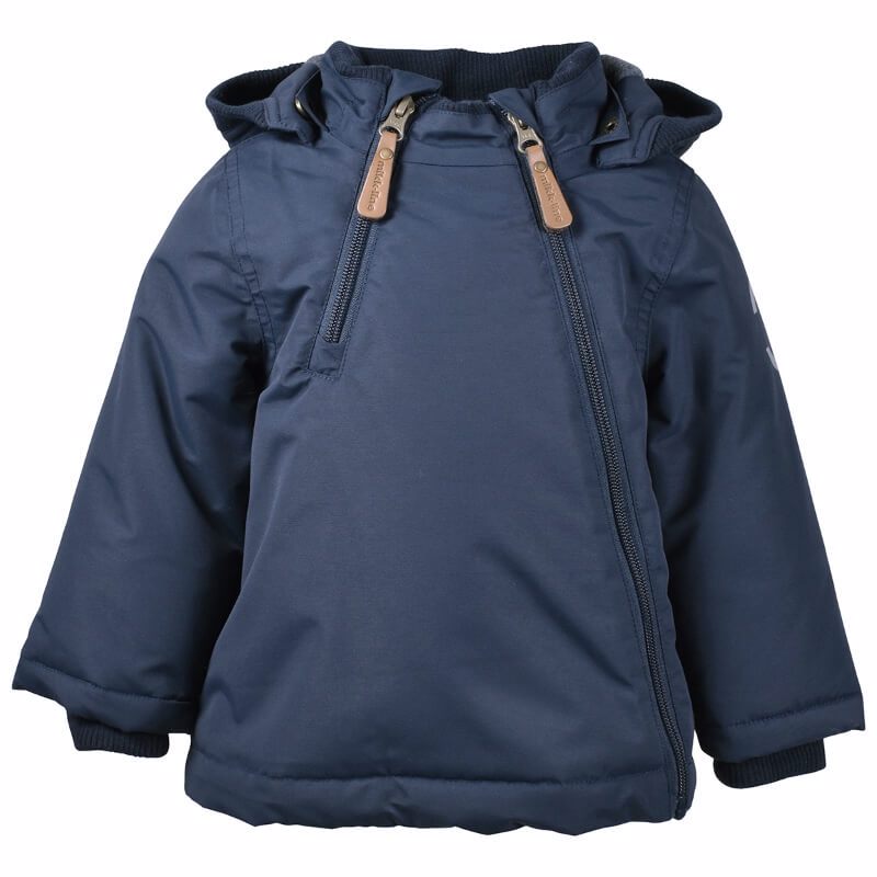Blue Nights nylon baby jacket fra Mikk-Line Super smart mørkeblå jakke med aftagelig hætte fra danske Mikk-Line til børn. Jakken har en asymmetrisk kvalitetslynlås, der går på skrå fra hagen og ned i venstre side af bunden. I højre side kan jakken