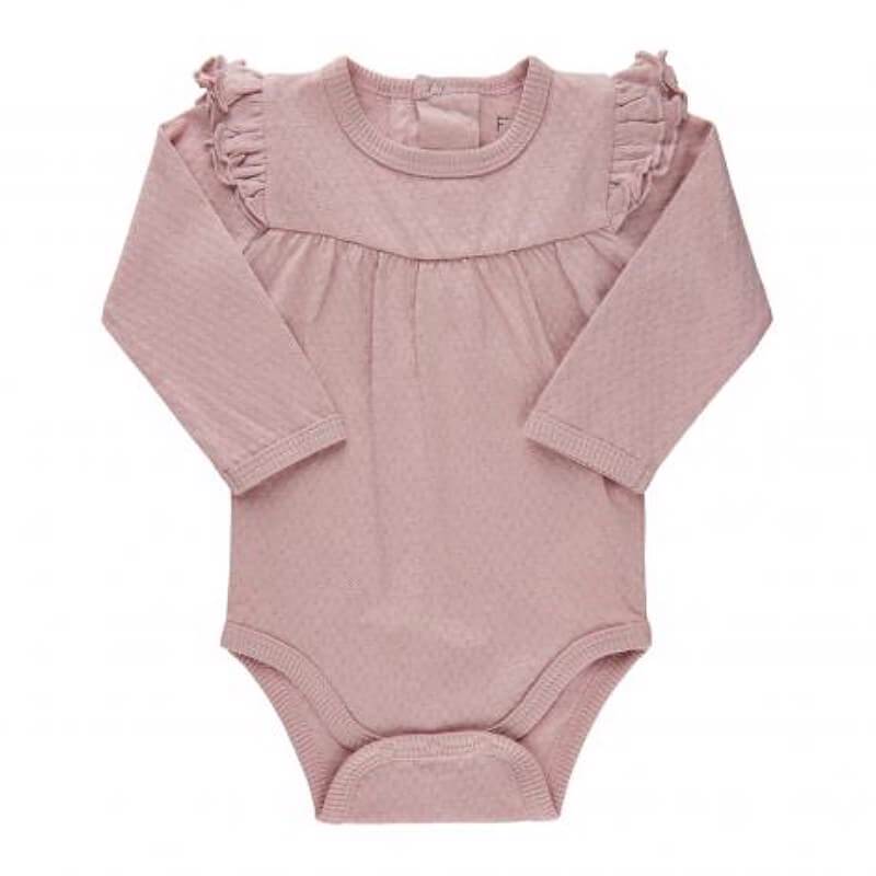 Soft rose body LS fra Fixoni En yndig og fin bodystocking i en flot rosa farve med lille flæsekant ved skuldrene fra danske Fixoni til piger. Bodyen har lange ærmer og en flot rund halsåbning. Den åbnes med 3 trykknapper mellem benene og bagpå. Stoff